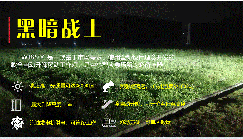 聯系人:劉經理經過我們恒盛照明對市場的用戶需求調查了解到,一些工礦企業,消防單位,防汛現場,搜救現場,夜間施工等行業,在夜間工作時有時候會遇到燈具取電照明困難等問題,而且一般的燈具無法滿足其照射高度和照射亮度的需求,根據這些用戶的反饋,我公司設計部經過大膽的設想,把發動機、燈具和升降桿組合在一起,形成了WJ850C的雛形,經過我們現場實際使用不斷的測試,讓其更加方便使用經過反復的測試修改,就是今天我們介紹的產品黑暗戰士WJ850C,從此不懼黑暗,夜如白晝。