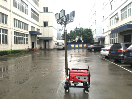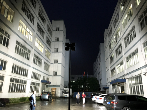 經過恒盛照明企業改成LED光源的SFW6110全方位自動升降泛光工作燈,光源選用了著名品牌LED芯片,色溫為5500K,正白光,防眩設計。效果怎么樣呢?為此,研發中心工作人員在一個雨后的夜晚在公司大院進行了測試。