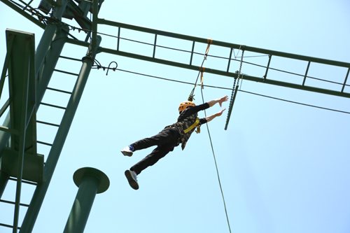 “飛躍2017”高空抓杠項(xiàng)目就是要在穿戴安全防護(hù)裝備及保護(hù)繩的情況下,徒手攀爬到20米高的平臺(tái),再邁到一根獨(dú)立風(fēng)中搖搖晃晃的圓柱上,拘身躍起,抓住兩米開(kāi)外的一根吊桿才算圓滿完成。筆者開(kāi)始就擔(dān)心起來(lái),倒不是安全問(wèn)題。就是覺(jué)得男生完成本項(xiàng)目應(yīng)該都不在話下,關(guān)健時(shí)平常說(shuō)話細(xì)聲細(xì)氣纖弱的女同事們可是一場(chǎng)天大的考驗(yàn)。