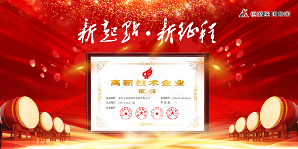 2017年11月13日,溫州市恒盛照明電器有限公司收到由浙江省科學技術廳,浙江省財政廳,浙江省國家稅務局,浙江省地方稅務局四部門聯合頒發的 《高新技術企業證書》。這對于恒盛照明來說,是繼LED固定照明產品通過中國質量認證中心的產品強制認證即3C認證后的又一大喜事,為恒盛照明2018年的良好發展開了一個好彩頭。